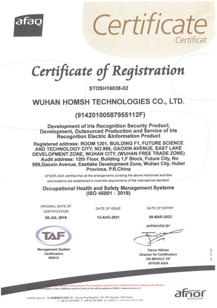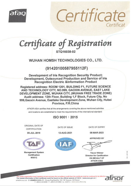Homsh Technologies, Kalite Yönetim Sistemi, İş Sağlığı Güvenliği Yönetim Sistemi Standartları,Çevre Yönetim Sistemi standartları ve Ulusal Fikri Mülkiyet Yönetim Sistemi standartlarıGüvenlik ve Güvenlik Alarm Sistemi Ürünleri için Ulusal Test Merkezi (Pekin),Güvenlik ve Güvenlik Alarm Sistemi Ürünlerinin Kalite Ulusal Test Merkezi (Şanghay), Guangzhou GRG Metrology & Test co., Ltd ve Fransa'daki Bell Labs.